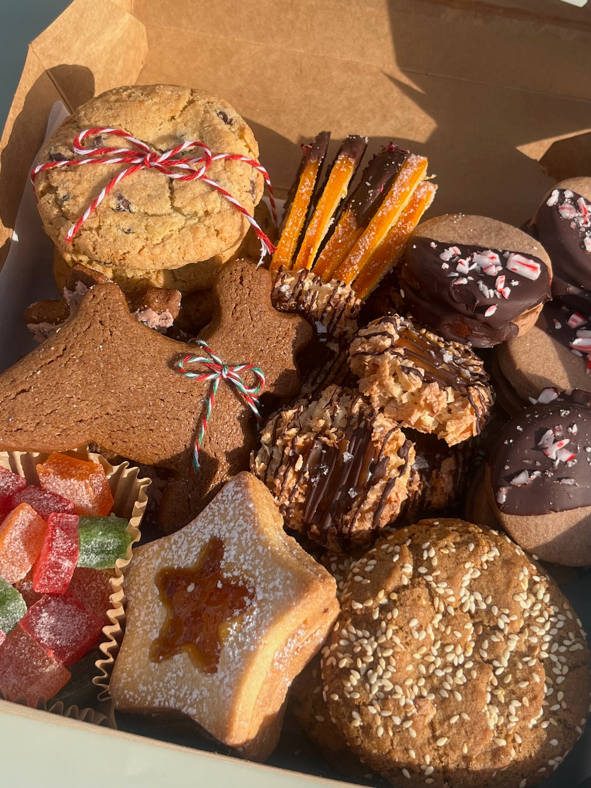 An assortment of cookies and candies made specially for the holiday season! Box includes 18 cookies, gumdrop candies, and candied oranges.
